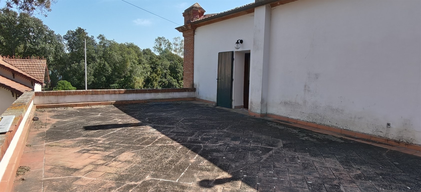 La costruzione risale alla prima metà del '900 e si sviluppa su due livelli fuori terra (piani T - 1°); essa è attualmente divisa in due unità abitative, una più grande ed una di dimensioni inferiori, ciascuna con ingresso autonomo ma comunicanti tra loro al piano terreno. L'unità più grande vanta una superficie coperta lorda di circa 190mq distribuiti su due livelli: il piano terreno ospita la zona giorno e si compone di ingresso con vano scale, sala con camino, disimpegno, ampia cucina con tinello e bagno.